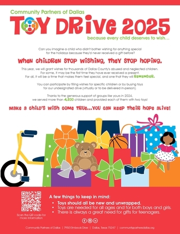 Community Partners of Dallas (CPD) will host its annual toy distribution event on Wednesday, December 17, providing holiday support to thousands of children involved in the child welfare system across Dallas County.